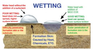 La caractéristique « d’agent mouillant » est une propriété singulière d’un matériau qui n’est pas nécessairement liée à sa réactivité ou à sa composition chimique. Il existe de multiples produits chimiques qui « mouillent l’eau » à des degrés divers mais qui ne mouillent pas forcément le substrat, quand d’autres vont mouiller le substrat mais pas l’eau. Ce cas de figure plus rare intervient pour des résidus issus de la fissuration ou d’autres réactions chimiques et qui contiennent des ligands soufrés.